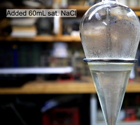- To dry the organic layer, add 60 mL of saturated NaCl solution. Remove and shake the funnel, then allow the layers to settle by placing the funnel back onto the stand.