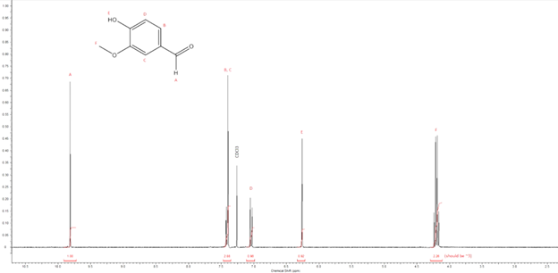 The purity test NileRed used was an NMR. The peaks on the spectrum correspond to expected molecular structure. Any peaks that do not align with the expected molecular spectrum would represent impurities. The spectrum provided in the video done with the resultant vanillin crystals shows the relatively high purity of the product. Alternative methods for testing purity in this case include analysis under a microscope and melting point analysis. Chemist myst32YT conducted a similar experiment, and observed his crystals had a long and thin shape indicating they are pure. He also used a melting-point apparatus to check if the melting point of his vanillin matched that of the documented melting point, 80℃. A closer match indicates a purer product (myst32YT, 2010).